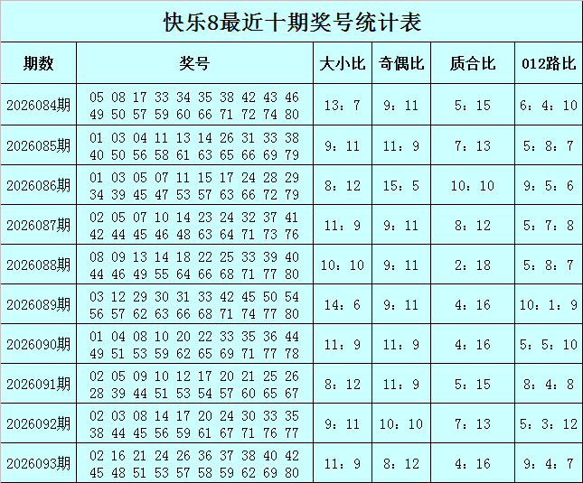福彩快乐8第2026093期开奖回顾:02 16 21 24 26 36 37 38 40 42 45 48 51 53 57 58 59 62 69 80,其中奖号大小比开出11:9,奇偶比开出8:12,质合比开出4:16,012路比开出9:4:7。